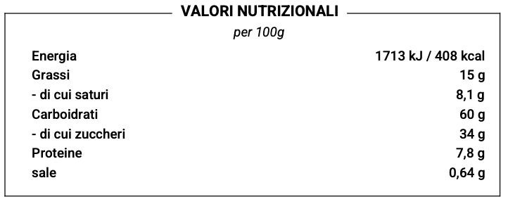 INGREDIENTI : farina di GRANO tenero tipo 0, scorza di arancia, sciroppo di glucosio-fruttosio, zucchero, UOVA, BURRO, zucchero di canna, acqua, uvetta di zibibbo, farina di GRANO tenero tipo 1, ALBUME D'UOVO, zucchero di canna, zucchero, amido di mais, MANDORLE, NOCCIOLE, farina di GRANO tenero tipo 0, sale, farina di mais, vaniglia, olio essenziale di arancia bio.